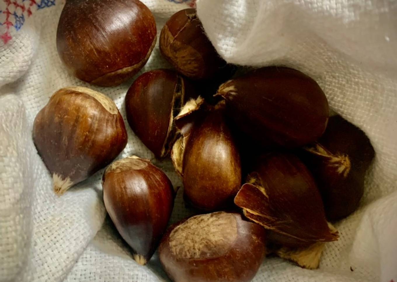 - Hacerle un corte a cada castaña. Poner en el estuche o en un bowl de microondas. (Importante el corte porque sueltan un gas y sino explotan)