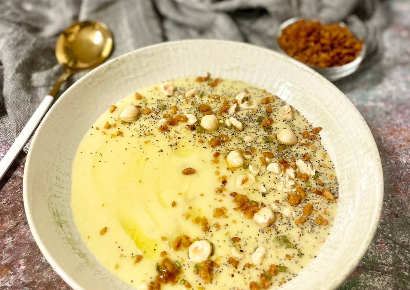 Hey everyone, hope you are having an amazing day today. Today, I will show you a way to make a distinctive dish, Crema de calabacín y avellanas con guisante texturizado al curry. One of my favorites. For mine, I will make it a little bit tasty. This is gonna smell and look delicious.