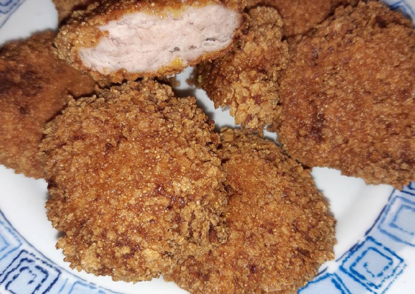 - Formar bolitas, pasar por huevo y por copos triturados.