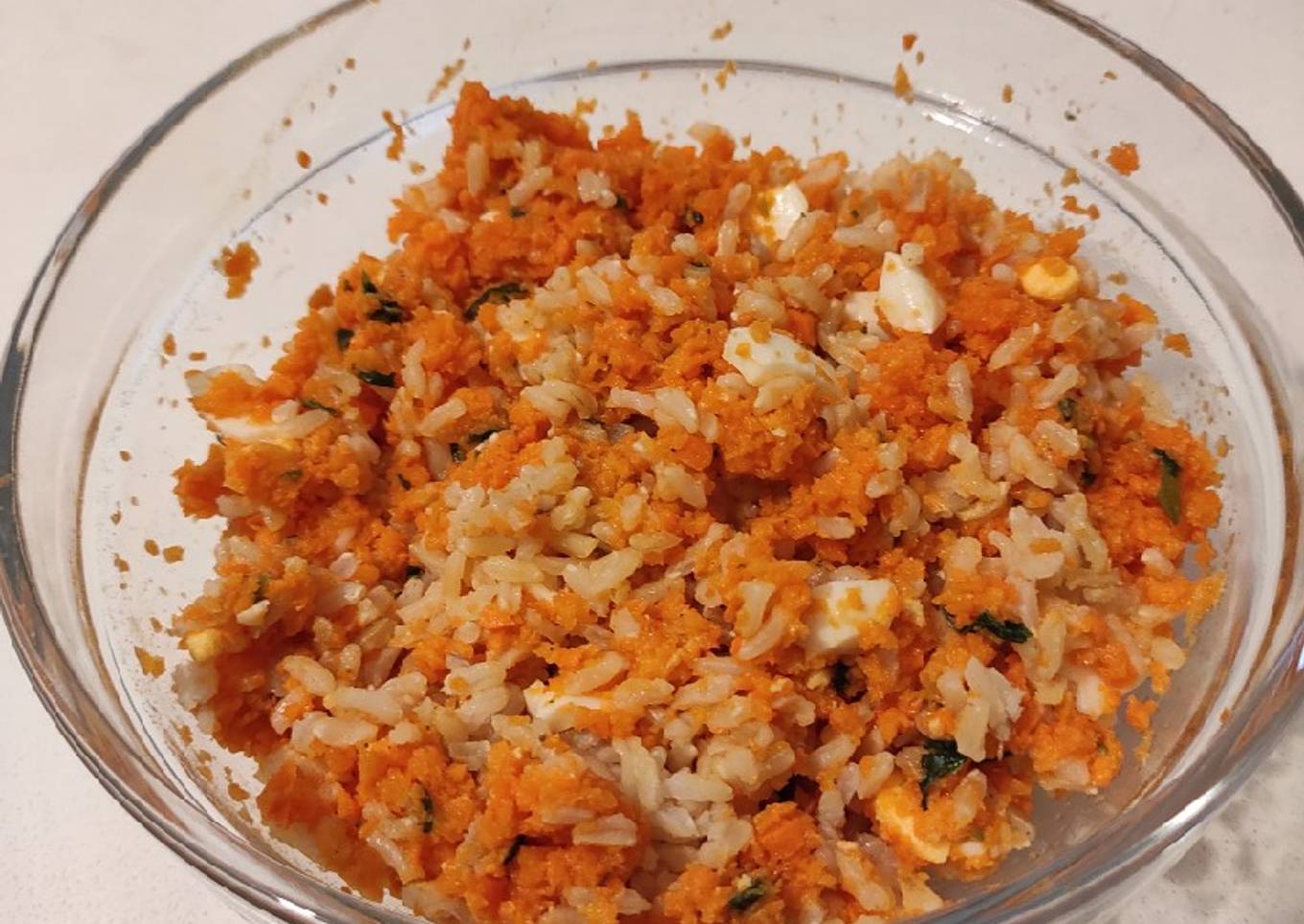 - Finalmente, picamos a mano los dos huevos cocidos y los añadimos a las zanahorias. Mezclamos todos los ingredientes y listo!