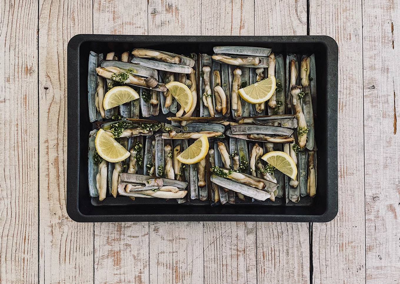 - En una bandeja para horno, colocamos las navajas y horneamos 10’ a 180º.