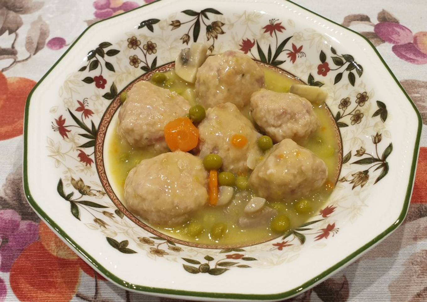 Albóndigas de pollo, pavo y jamón a la jardinera