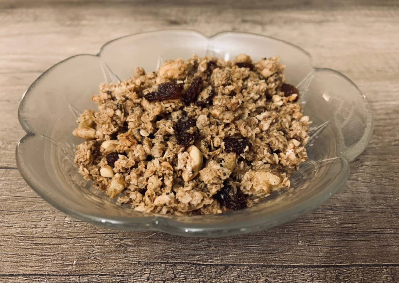- Introducimos en un bol los frutos secos troceados + hojuelas de avena + azúcar moreno + canela molida + semillas + uvas pasas + pellizco de sal. Lo mezclamos e integramos todo bien.