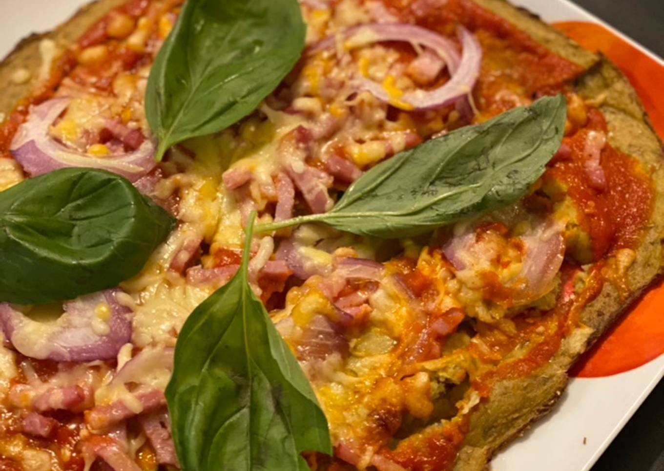 - Yo le puse: tomate frito casero, bacon, cebolla y queso de pizza. Lo he metido 15 minutos más en el horno a 200 grados y una vez fuera, las hojas de albahaca por encima.