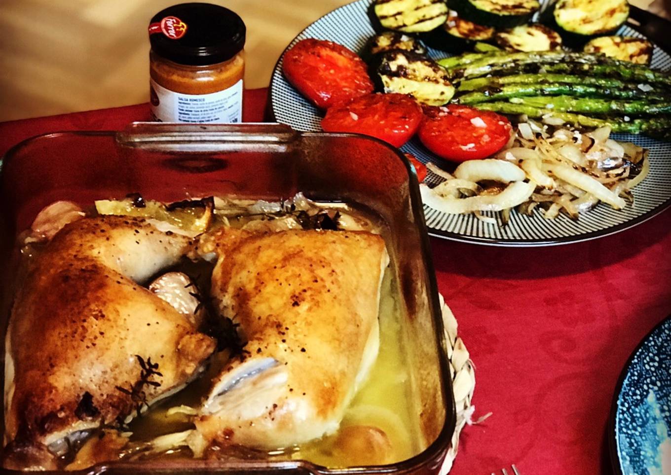 Pollo asado receta tradicional con parrillada de verduras y romescu