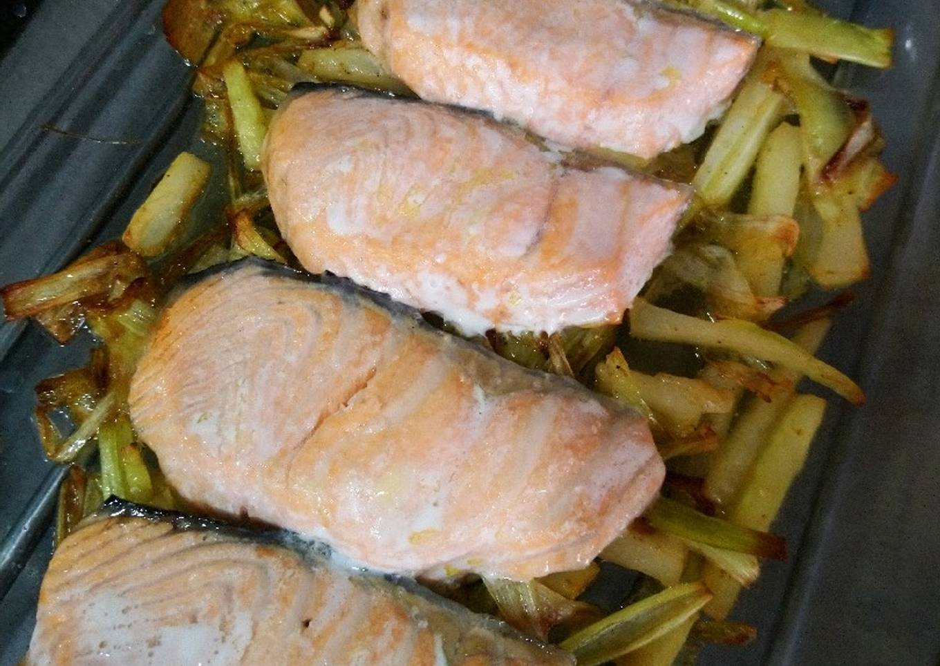 - En una bandeja de horno colocamos de base el puerro y encima ponemos los filetes de salmón, salamos