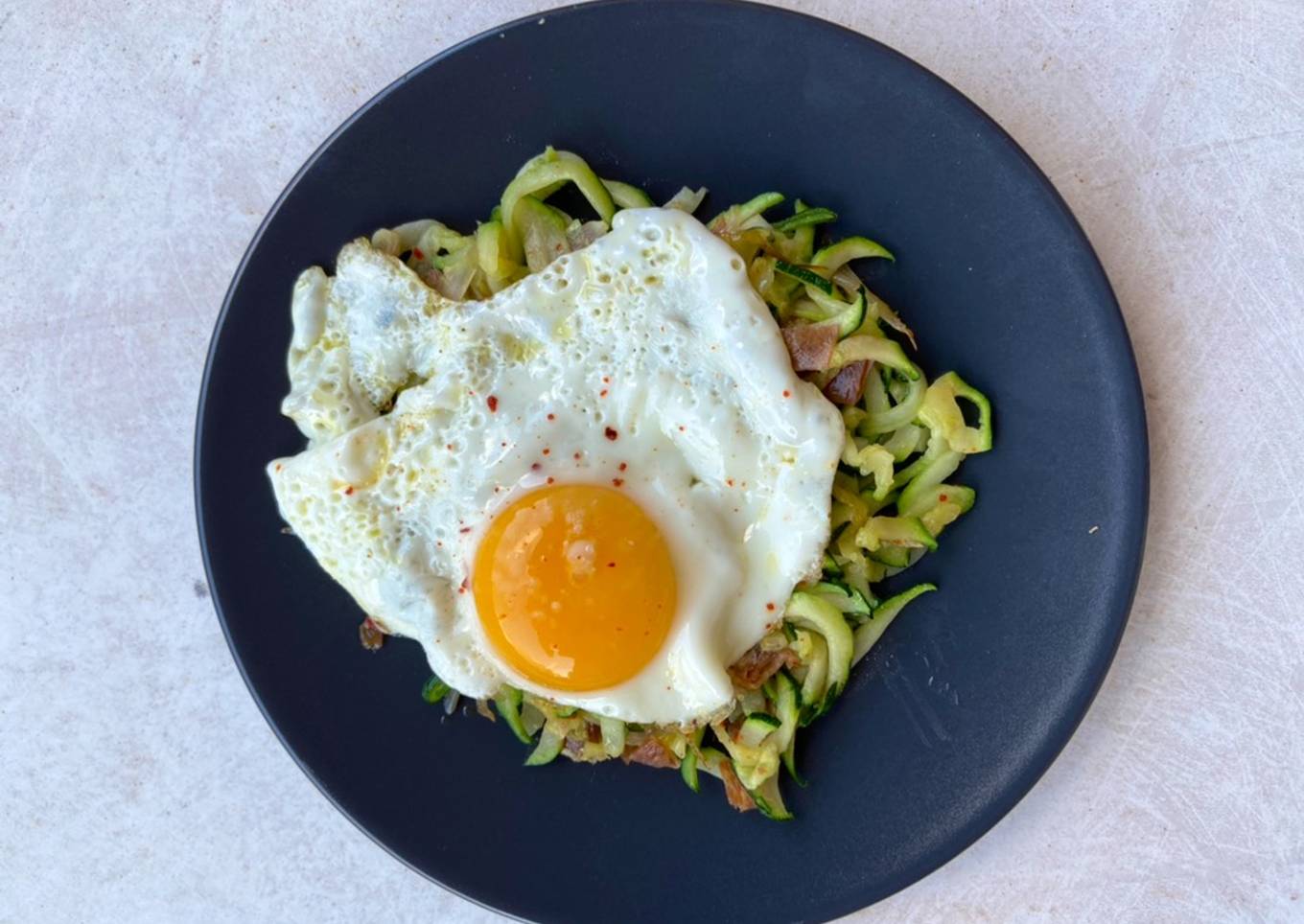 Spaghetti de calabacín con jamón y huevo a la plancha