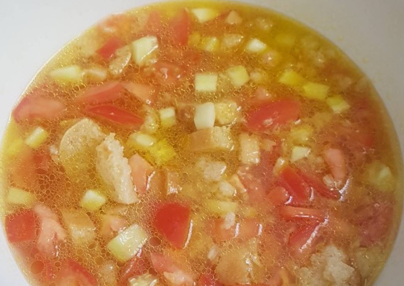 - Lo mezclamos todo bien y añadimos el vingre y el agua (que quede consistencia de sopa ligera, pero a gusto de cada uno). Probamos y rectificamos de sal, aceite y vinagre según los gustos particulares. Buen provecho.