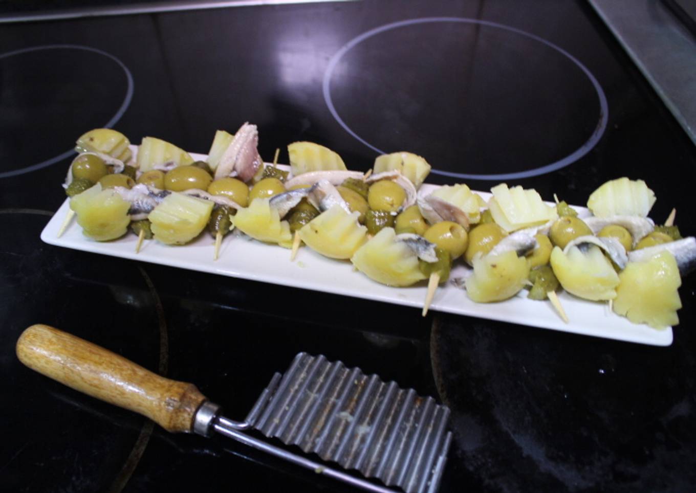 - Unimos con la ayuda de un palillo, por el siguiente orden, un trozo de patata, un trozo de boquerón, una aceituna y un trocito de pepinillo hasta terminar todos los ingredientes.