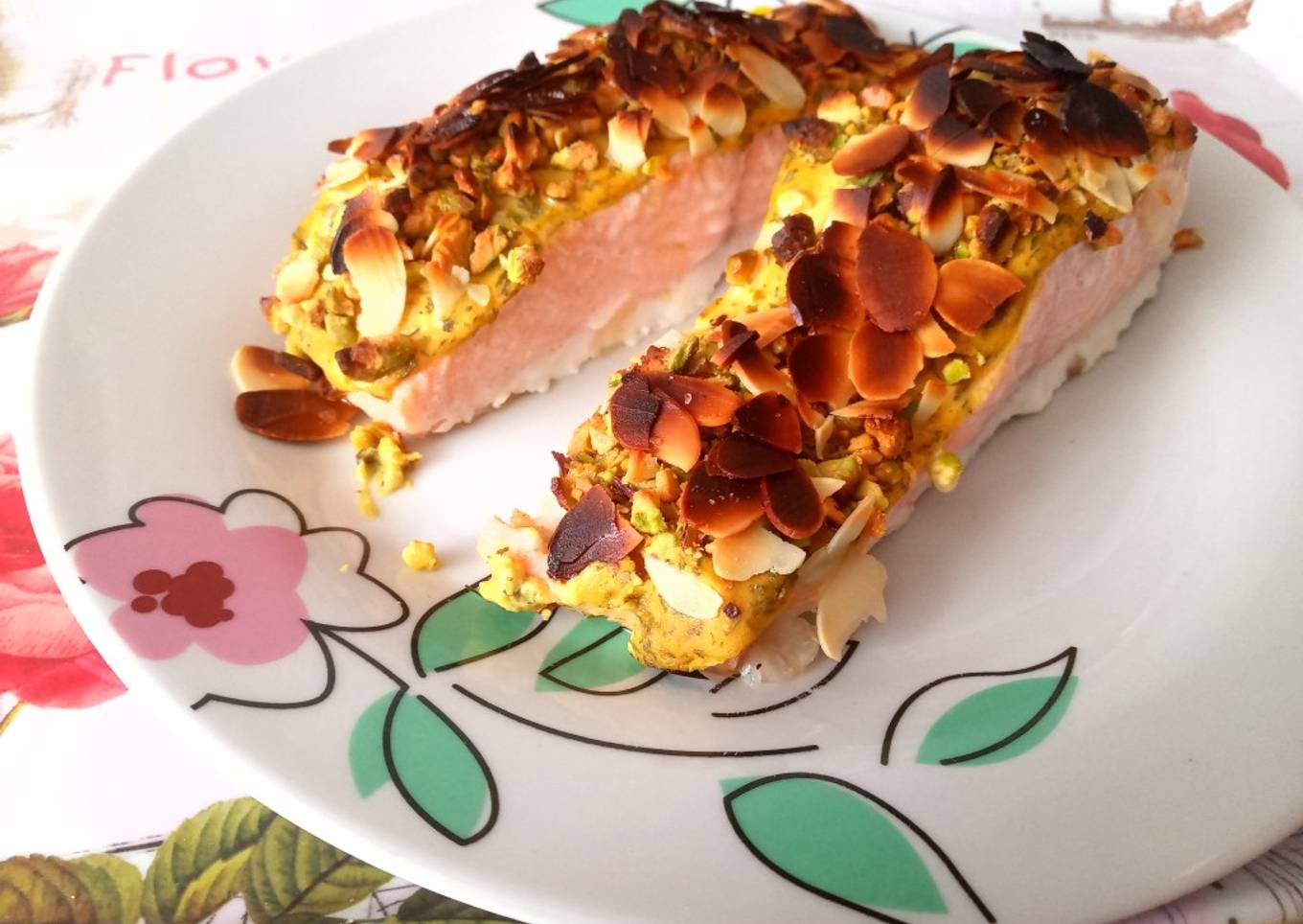 Instructions to make to make Salmón al horno con mostaza y almendras