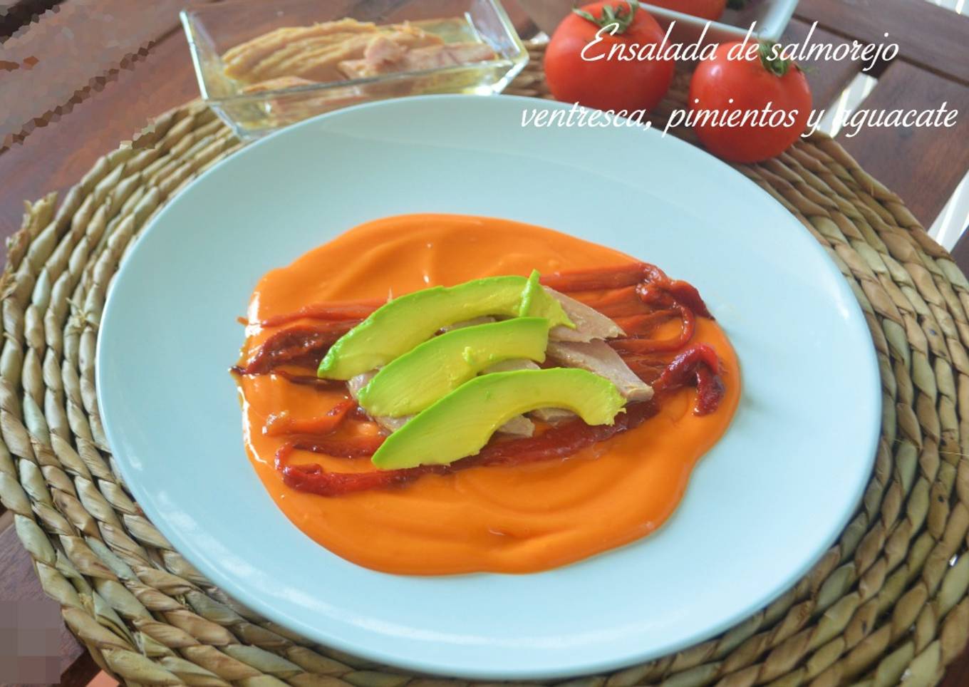 - En una fuente pon una base de salmorejo y encima los pimientos asados, la ventresca y el aguacate. Sirve inmediatamente.