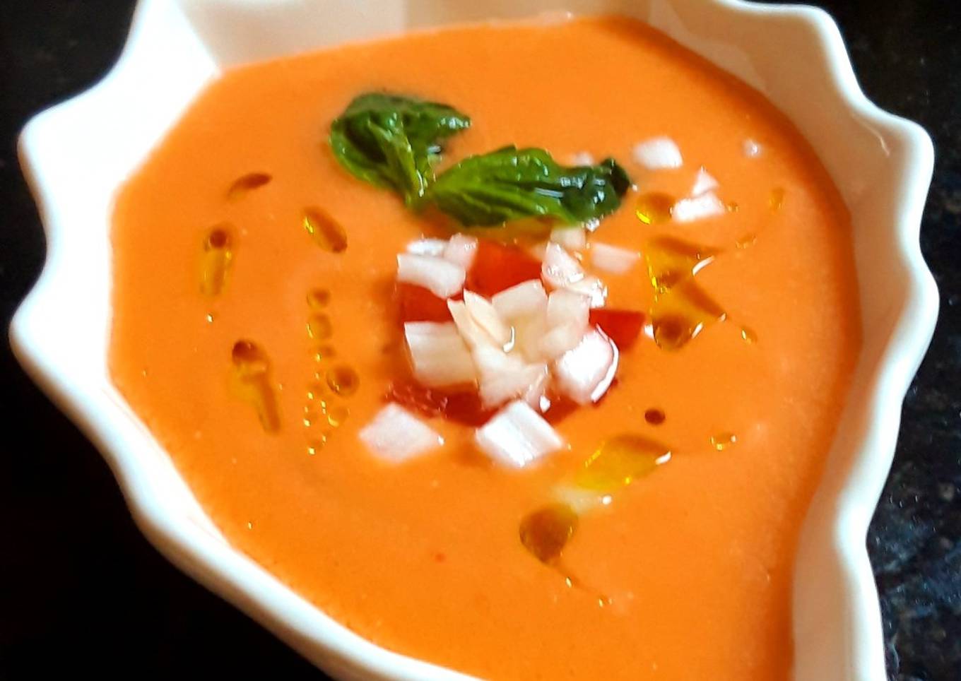 - Queda riquísimo como sopa fría con tropezones de cebolla, pepino, pimiento y unas hojas de albahaca