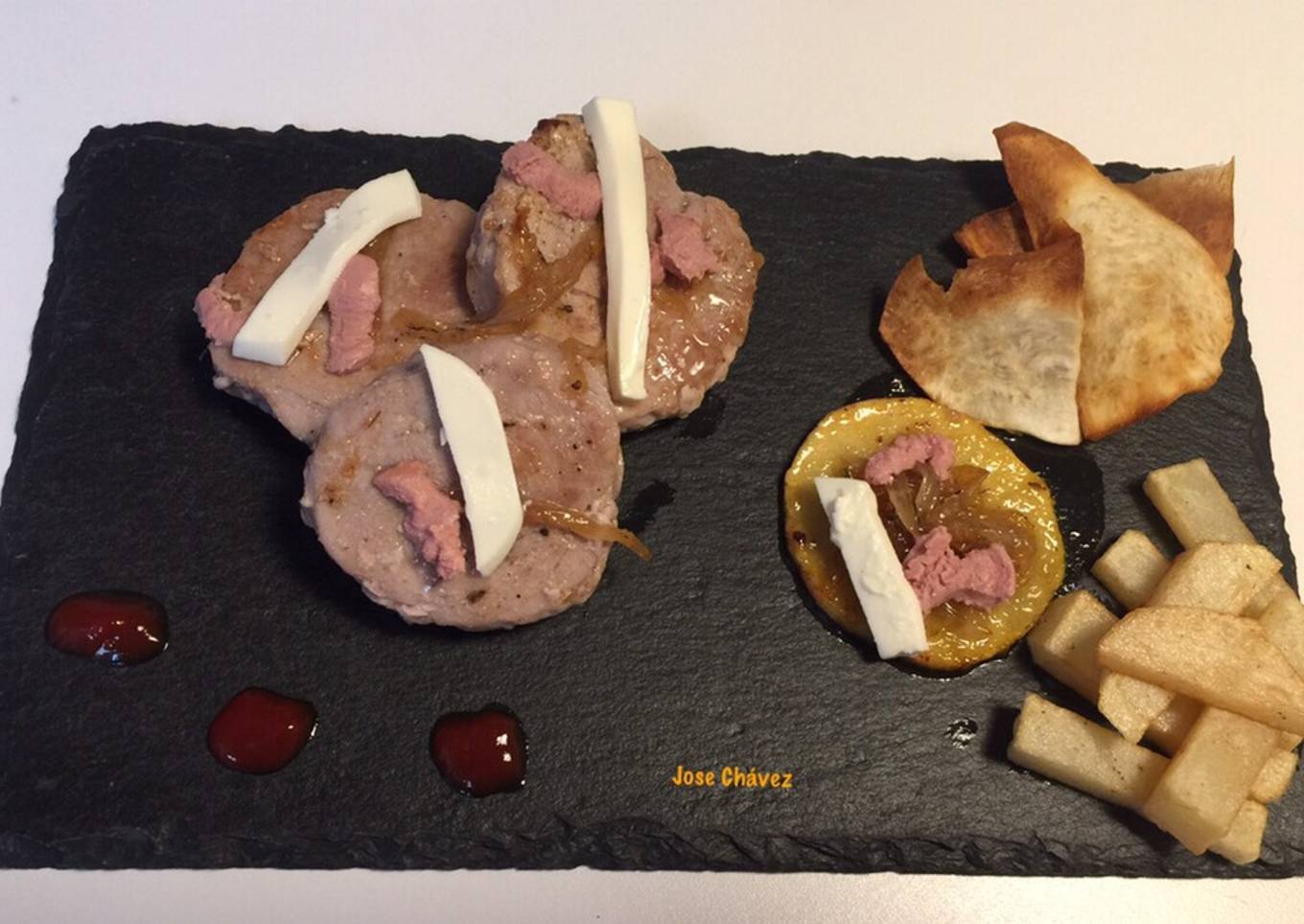 Medallones de solomillo con foie, queso de cabra, chips de batata, cebolla y manzana caramelizada