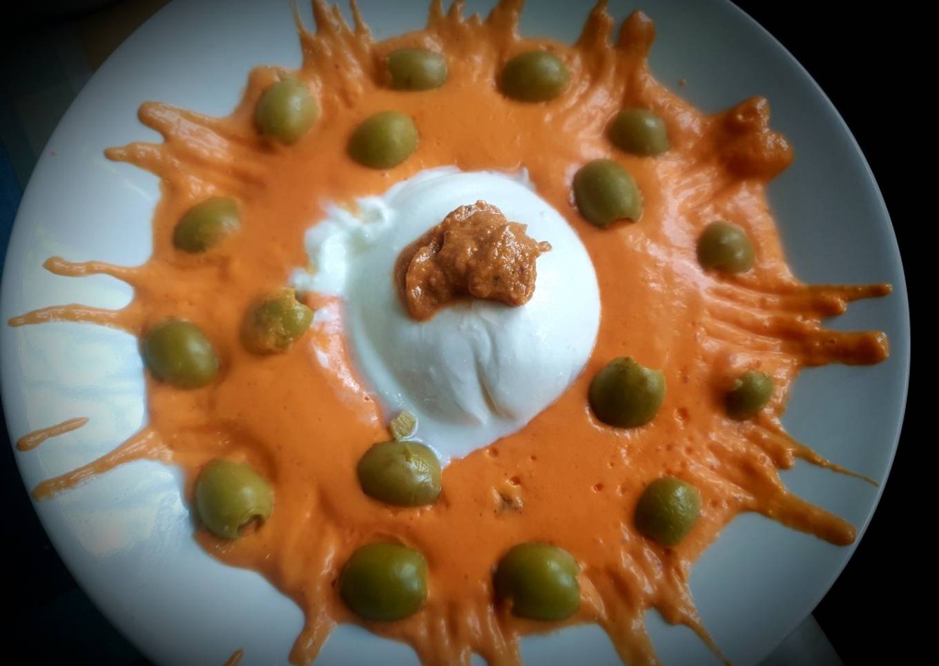 - Mientras se enfría nuestro salmorejo escurrimos bien nuestra burrata, cortamos en mitades las aceitunas y preparamos para emplatar. Ponemos el salmorejo, colocamos las aceitunas y la burrata en el centro con una cucharadita de pesto de nueces... a disfrutar!!!!