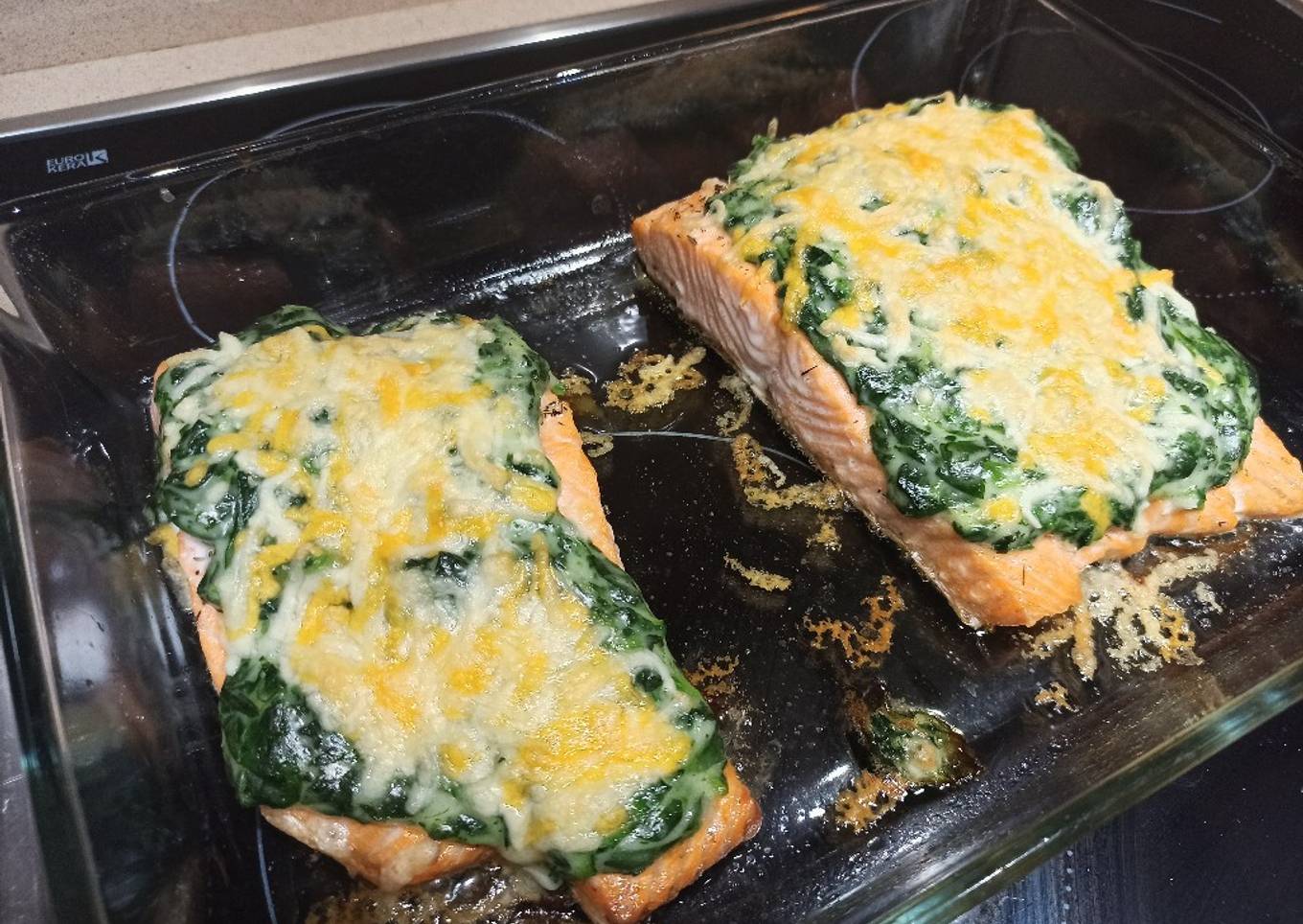 - Cuando el salmón ya esté al punto, cubrimos con la mezcla de espinacas y bechamel y añadimos el queso y a gratinar!!