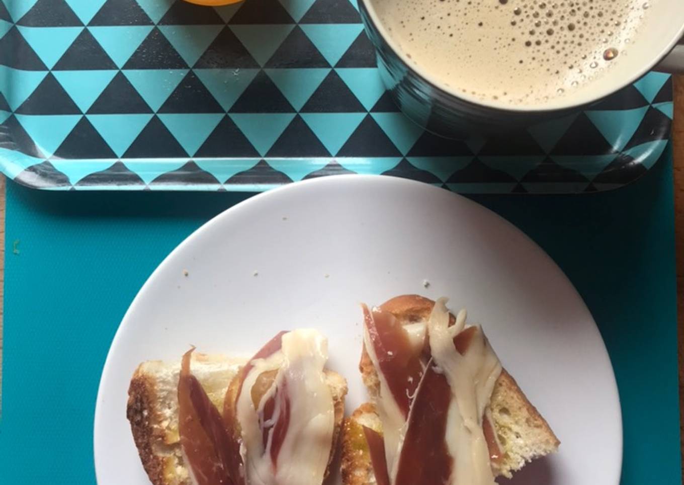 Pan con ajo y jamón, café con leche de avena y zumo de naranja : a desayunar!!