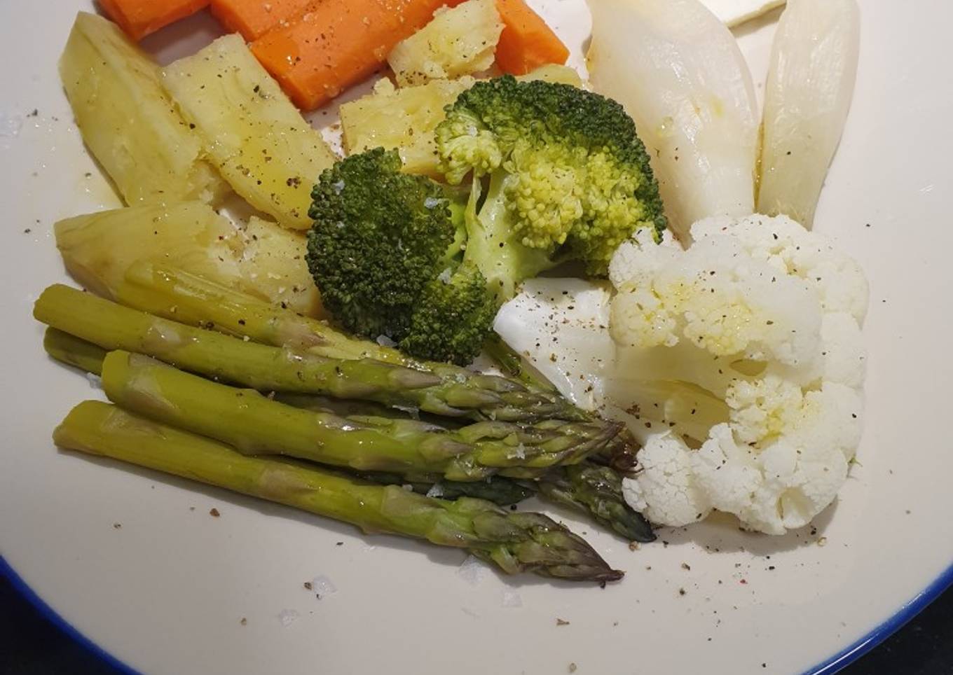 - Poner una olla con agua a calentar. Pelar y trocear la verdura y colocar sobre la vaporera. Cuando está hirviendo el agua, colocar con cuidado la vaporera encima de la olla.
