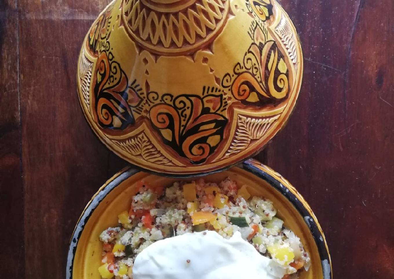 - Calentamos un poco de AOVE en una cazuela. Pochamos la cebolleta, los ajos laminados, y los tres pimientos a fuego muy suave, bajo tapa, durante 10 minutos. Añadimos la zanahoria y pochamos 10 minutos más. Ahora, añadimos el calabacín y pochamos otros 5 minutos. Sazonamos y condimentamos con media cucharadita de especias Ras El Hanout. Agregamos la quinoa y retiramos del fuego.