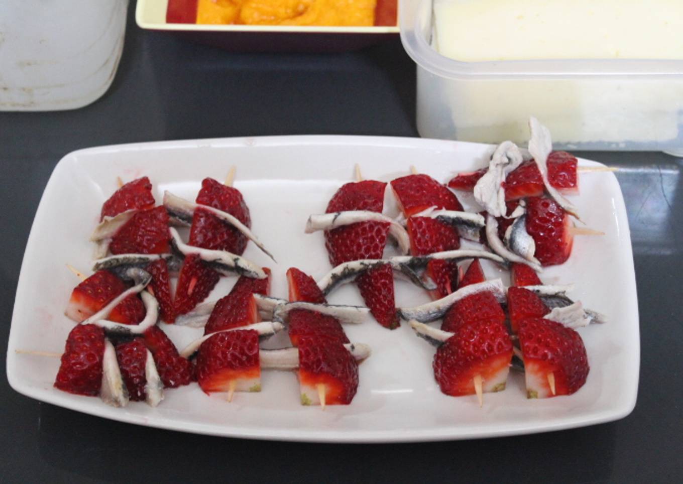 - Insertamos en palillos, tres trozos de fresón, intercalando entre ellos dos lomos de boquerón.