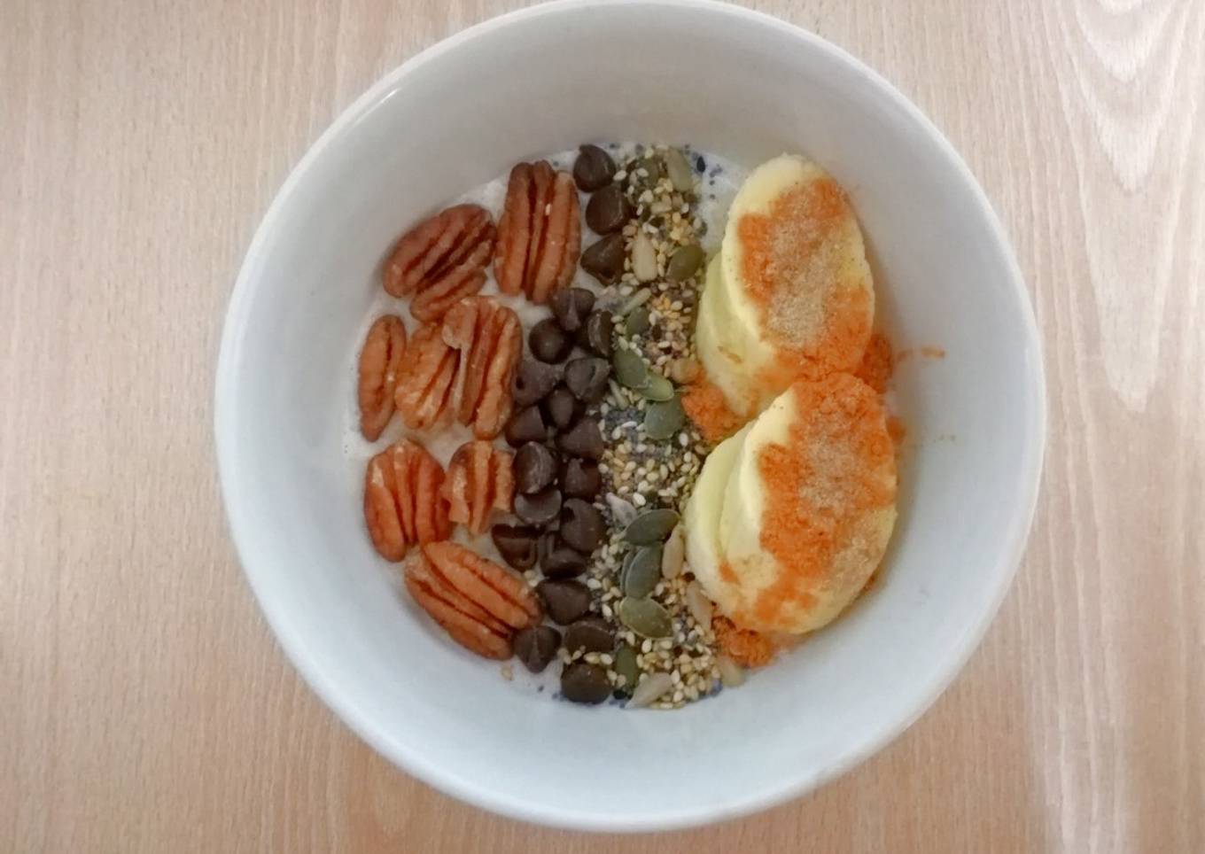 - Cuando veas que espesa, repártelo en cuencos y pon por encima la fruta troceada, las semillas, los frutos secos y las pepitas de chocolate. Espolvorea con canela molida y listo!!